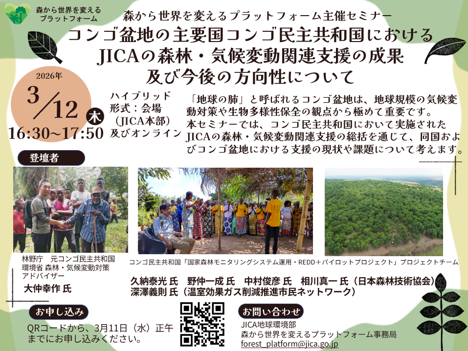 国際協力機構(JICA)では、森林総合研究所と共同事務局をしている、森から世界を変えるプラットフォーム(森プラ※)事務局主催により、対面×オンラインセミナー「コンゴ盆地の主要国コンゴ民主共和国におけるJICAの森林・気候変動関連支援の成果及び今後の方向性について」を開催いたしますのでご案内いたします。